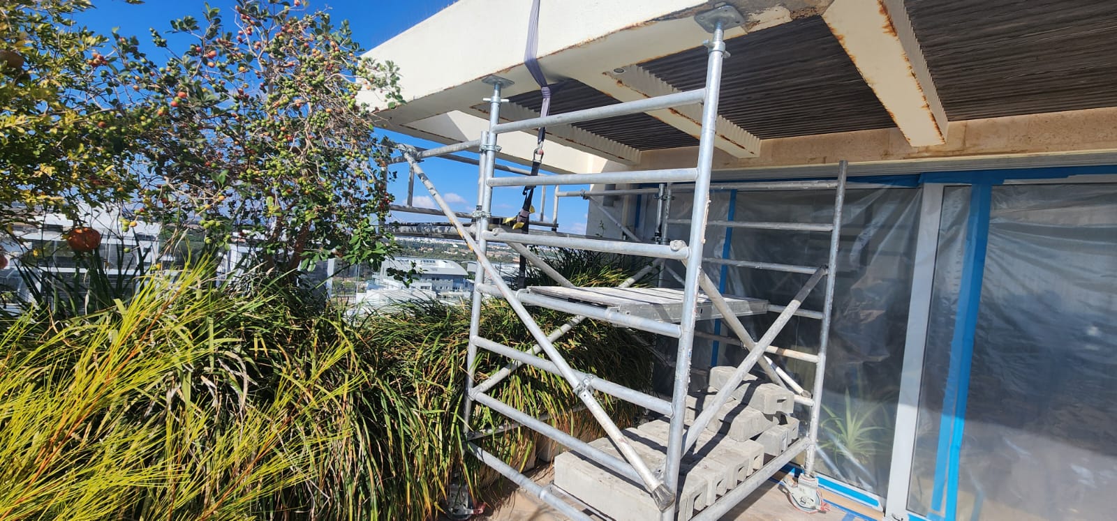 בחזית המבנה לא הייתה אפשרות להציב עמודי פיגום. השטח למטה היה סגור. המרפסת הקונזולית אפשרה עבודה צמודה לקיר. היא נתנה יציבות מלאה. היא שמרה על מעבר חופשי מתחת לפיגום.